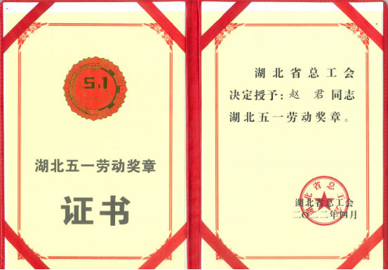 2022年4月,趙君被授予湖北五一勞動獎章