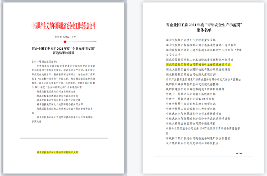近日,湖北省企業團工委公布2021年度“企業標桿團支部”和“青年安全生產示范崗”評選結果,橋隧公司團支部榮獲“企業標桿團支部”,鄖西PPP項目榮獲“青年安全生產示范崗”。
