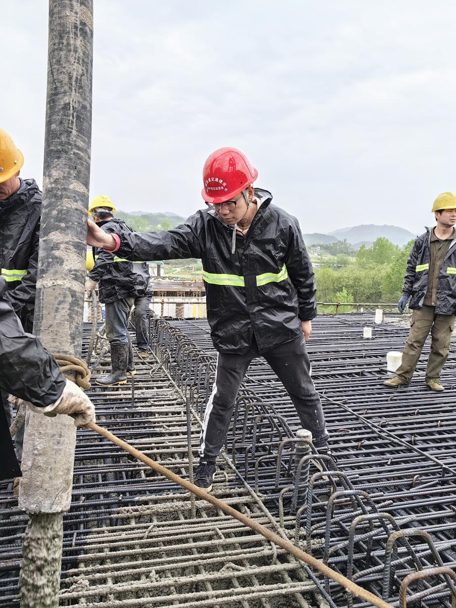 鄖西PPP項目天河口大橋是漢江上最大跨徑的獨塔預(yù)應(yīng)力混凝土斜拉橋,剛參加工作就能參與大型斜拉橋項目的建設(shè),劉邦感到無比幸運也壓力巨大,但他并沒有退縮。針對塔柱截面尺寸變化復(fù)雜,他熬夜摸索預(yù)應(yīng)力槽口分布以及低回縮二次張拉工藝,到現(xiàn)場給工人師傅做安全技術(shù)交底,反復(fù)強(qiáng)調(diào)施工流程,確保順利施工;針對主梁前支點牽索掛籃施工,他虛心請教,堅持在現(xiàn)場和工人師傅們一起拉尺復(fù)核預(yù)埋孔和軌道定位,并全過程參與指揮掛籃的下放、行走和提升。原先白凈的書生男孩在施工一線曬得皮膚黝黑,“一線工作雖然辛苦,但這卻是我成長最快、進(jìn)步最大的項目,從聽令行事到自己拿主意解決現(xiàn)場問題,從按時完成工作到主動完成工作,這對我來說意義重大。”劉邦說到。