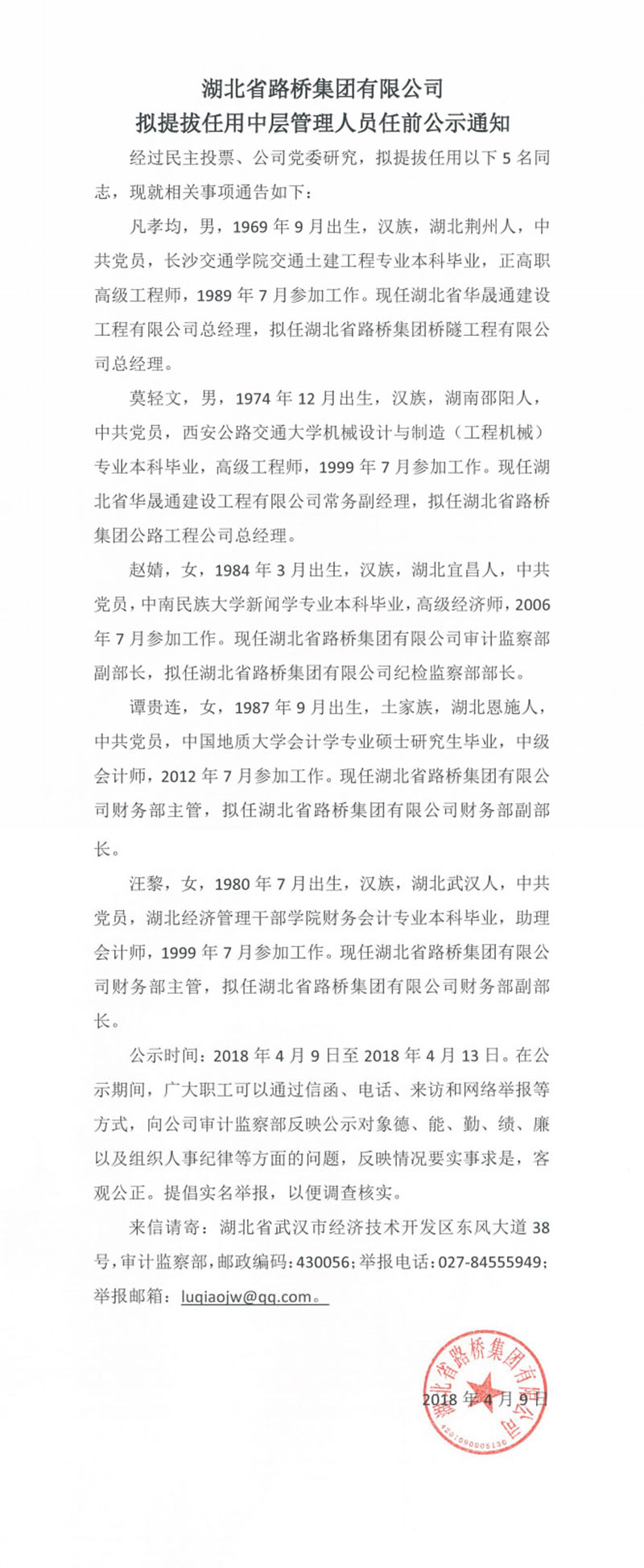 湖北省路橋集團(tuán)有限公司擬提拔任用中層管理人員任前公示通知