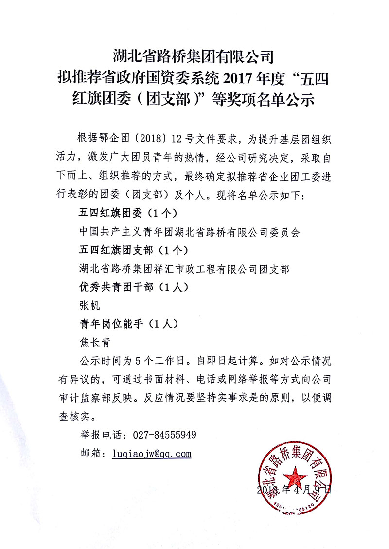 湖北省路橋集團有限公司擬推薦省政府國資委系統2017年度”五四紅旗團委(團支部)“等獎項名單公示