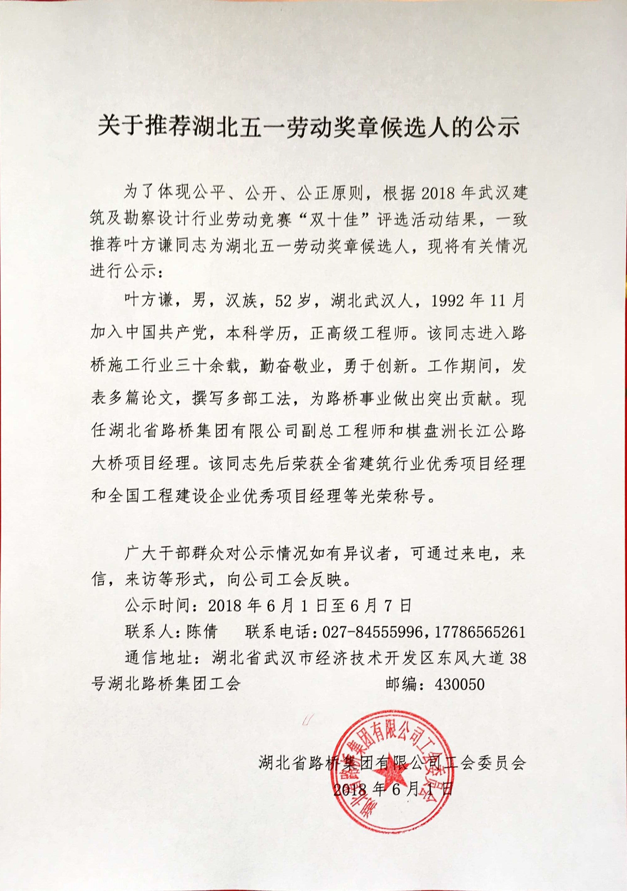 關于推薦湖北五一勞動獎章候選人的公示