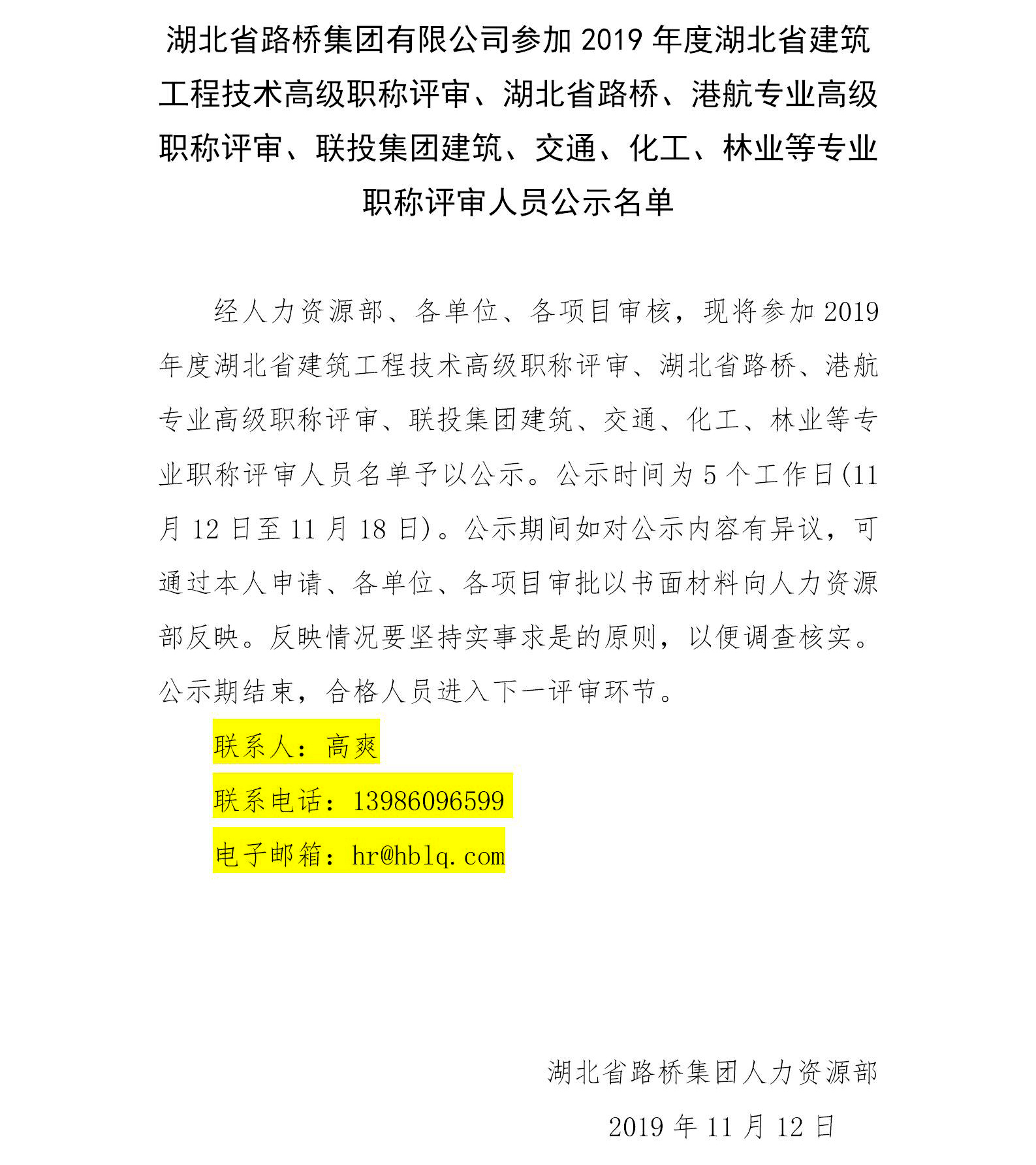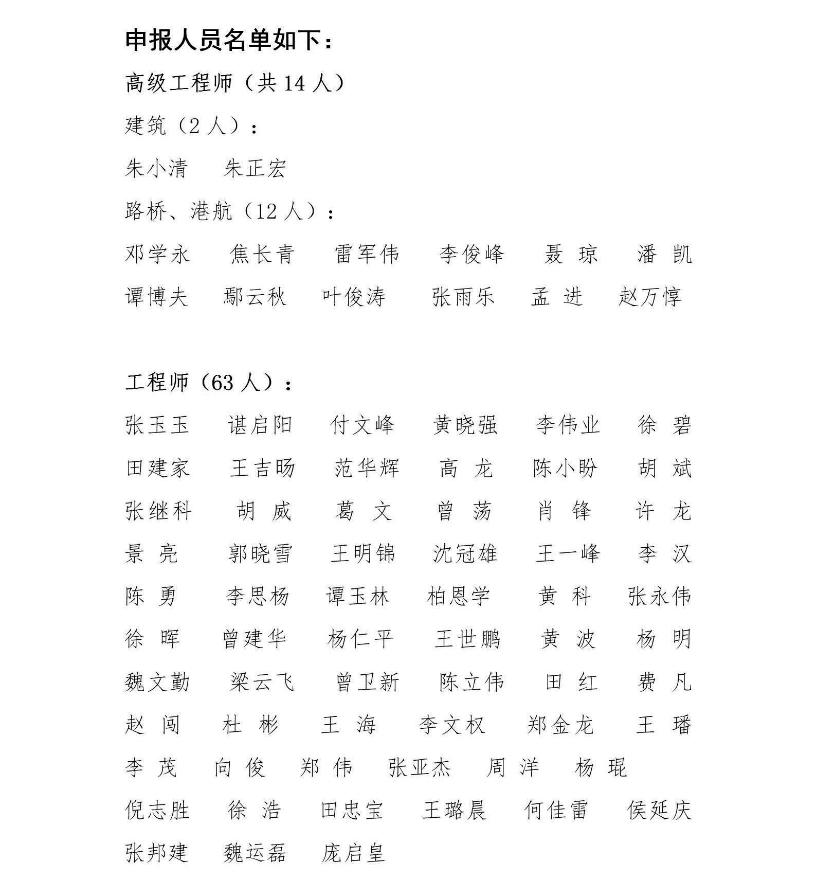 湖北省路橋集團有限公司參加2019年度湖北省建筑工程技術(shù)高級職稱評審、湖北省路橋、港航專業(yè)高級職稱評審、聯(lián)投集團建筑、交通、化工、林業(yè)等專業(yè)職稱評審人員公示名單