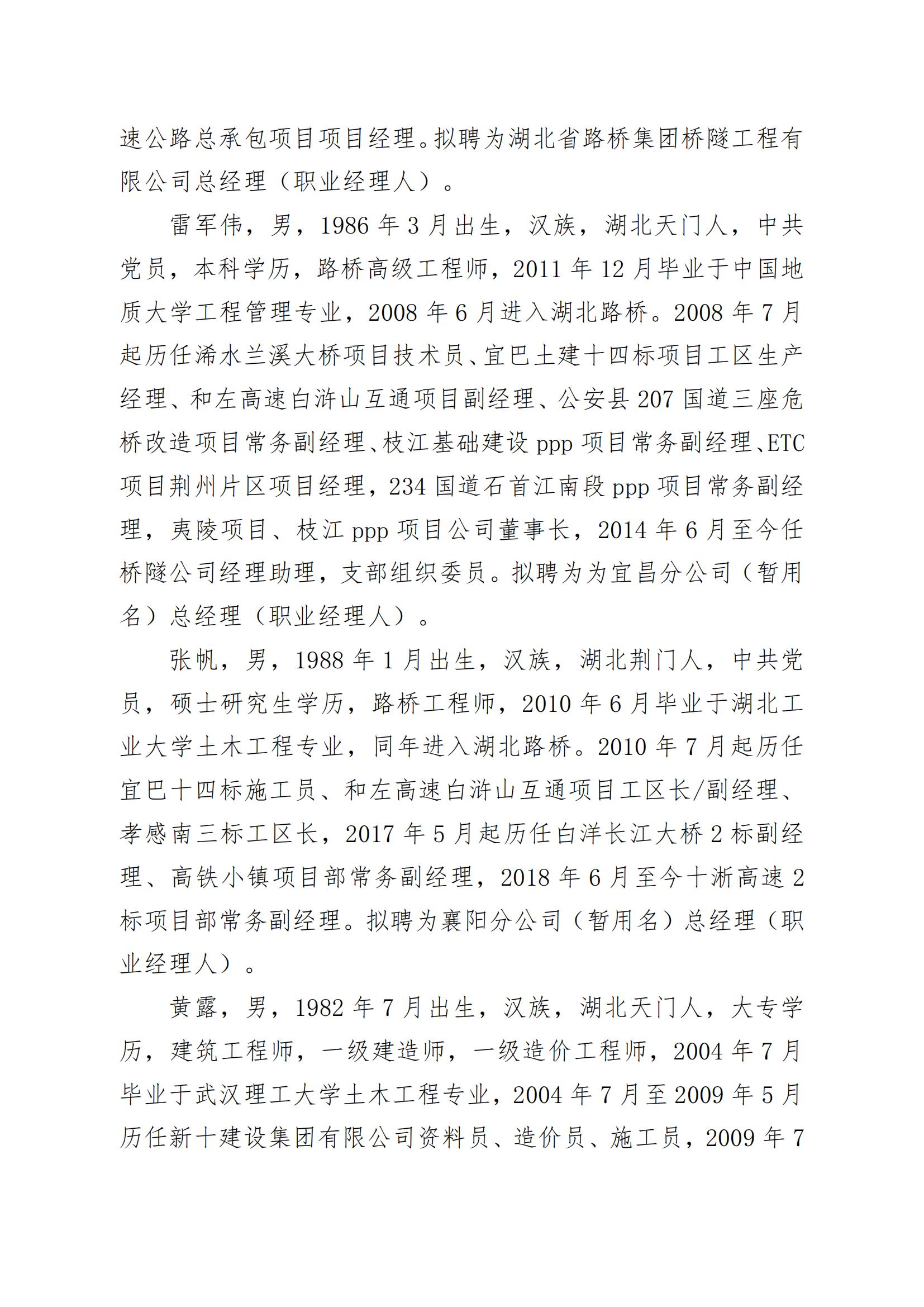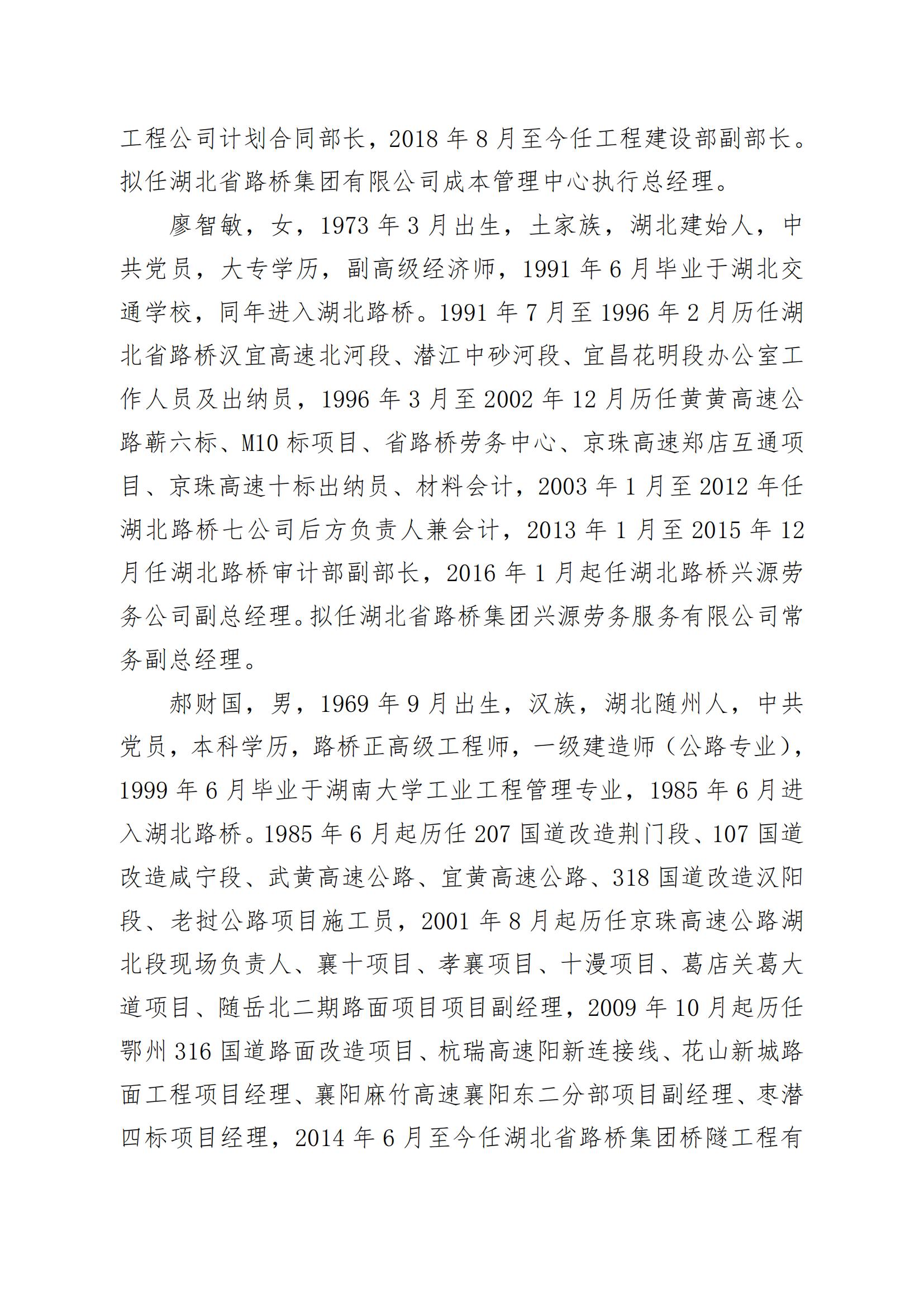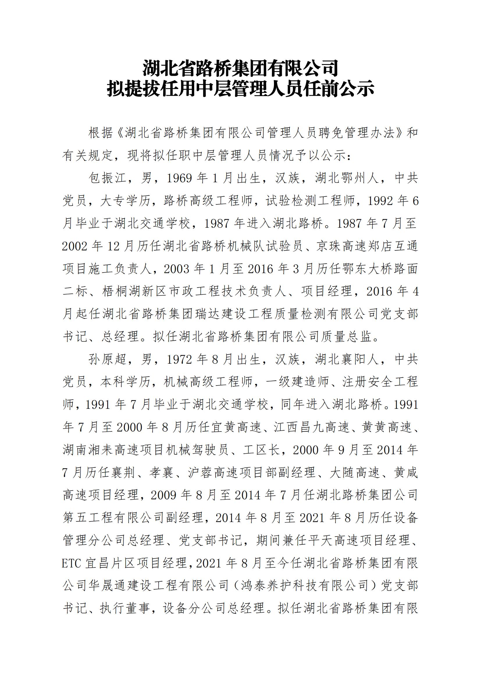 湖北省路橋集團(tuán)有限公司擬提拔任用中層管理人員任前公示