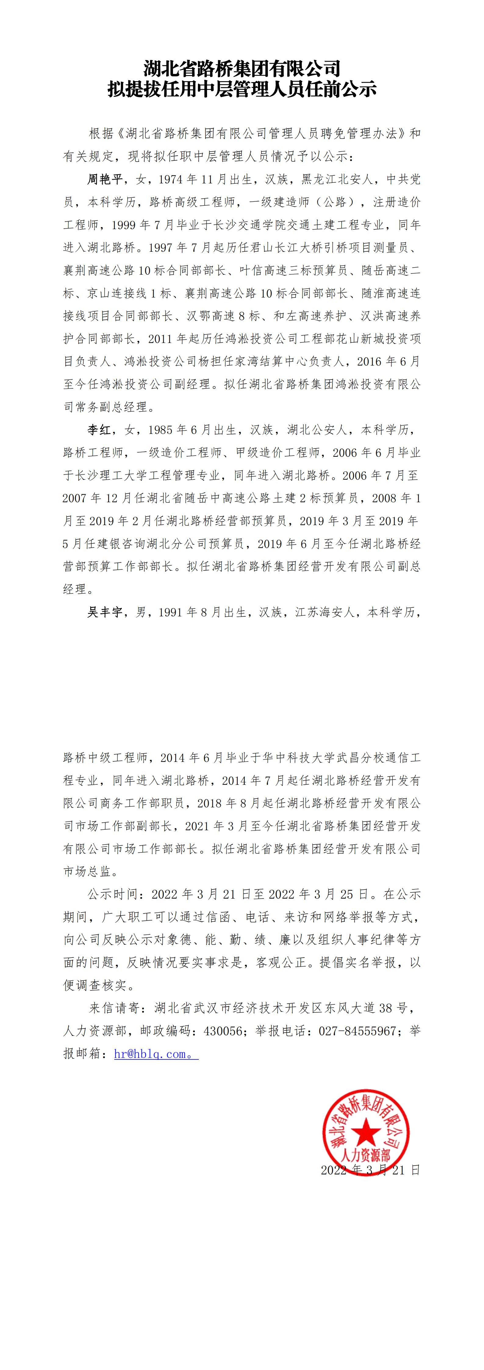 湖北省路橋集團(tuán)有限公司擬提拔任用中層管理人員任前公示
