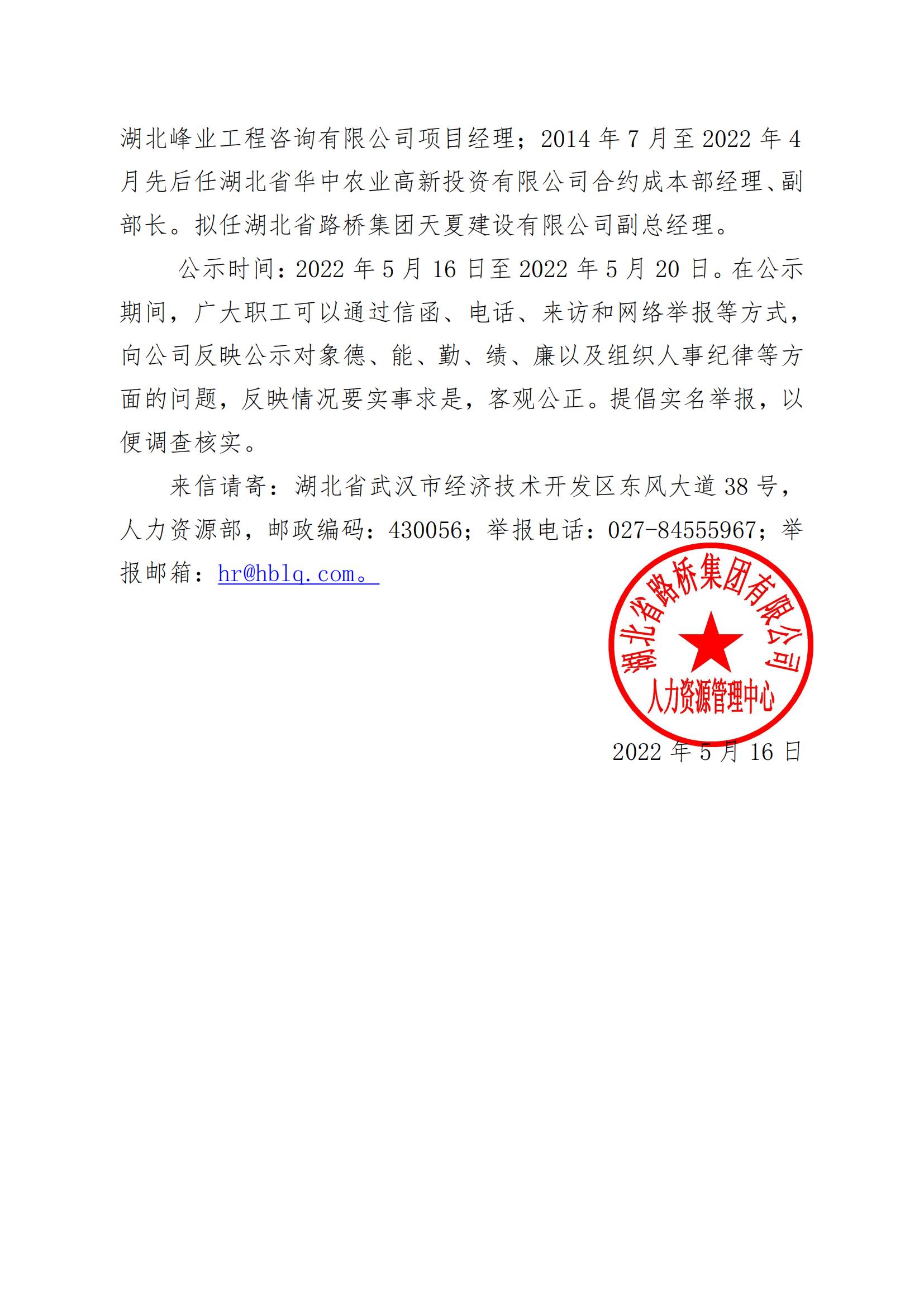 湖北省路橋集團(tuán)有限公司擬提拔任用中層管理人員任前公示