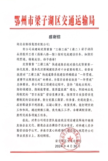 近日,湖北路橋高新八路一期品質提升及改擴建工程項目部收到鄂州市梁子湖區交通運輸局、鄂州市公安局交通管理局梁子湖大隊的感謝信及表揚信,對高新八路一期項目保質保量完成建設任務,如期實現全線貫通給予高度肯定。