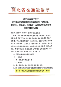 近日,湖北省交通運輸廳發布兩則關于武漢新城與鄂黃黃快速道路系統建設的通報,由湖北路橋承建的吳楚大道項目、高新八路一期項目分別獲評年度“紅旗”項目、百日攻堅勞動競賽優勝項目。