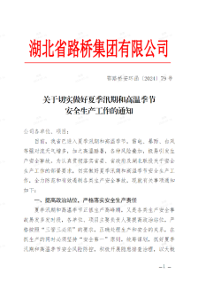 汛情就是命令,責任重于泰山。湖北路橋迅速發布《關于切實做好汛期安全生產工作的通知》《關于切實做好夏季汛期和高溫季節安全生產工作的通知》,安排部署加強汛期安全防范工作。各分子公司、各項目積極響應,按照“三管三必須”要求,抓好汛期安全風險防控工作,嚴格落實安全生產責任,狠抓安全防范措施落實,堅決筑牢防汛“安全堤”。全體員工繃緊防汛這根弦,堅決克服麻痹、僥幸心理,以“時時放心不下”的責任感,落細落實各項防汛措施,確保安全度汛。
