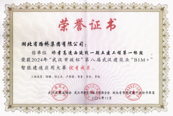 11月8日,由武漢建筑業(yè)協(xié)會、武漢市建筑工會聯(lián)合會、湖北省智能建造產(chǎn)業(yè)協(xié)作聯(lián)盟共同舉辦的2024年“武漢市政杯”第八屆武漢建筑業(yè)“BIM+”智能建造應(yīng)用大賽決賽在武漢舉行,湖北路橋“硚孝高速西延線一期土建工程第一標(biāo)段”BIM應(yīng)用成果榮獲“優(yōu)秀成果獎”。