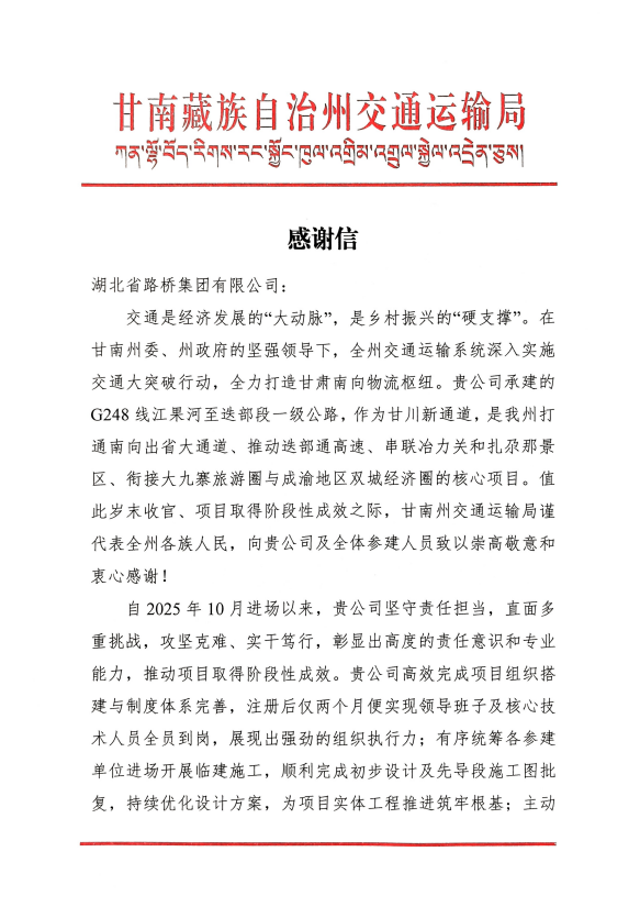 甘南藏族自治州交通運(yùn)輸局近日發(fā)來感謝信,對(duì)湖北路橋承建的G248線江果河至迭部段一級(jí)公路項(xiàng)目取得的階段性成效給予高度肯定與誠摯贊譽(yù)。