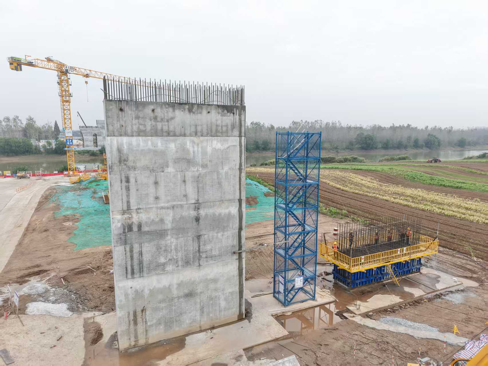 本次封頂?shù)?/span>4#過渡墩是連接松虎河引橋與主橋的關(guān)鍵墩位,采用分離式矩形實(shí)體墩設(shè)計,具有結(jié)構(gòu)穩(wěn)定、承載能力強(qiáng)的特點(diǎn)。墩身橫橋向?qū)?米、順橋向?qū)?.2米,采用C40高性能混凝土現(xiàn)澆工藝,澆筑方量達(dá)317.1立方米。為保障混凝土強(qiáng)度與耐久性,施工完成后立即啟動定時自動噴淋養(yǎng)生系統(tǒng),通過智能控制濕度與頻次,有效預(yù)防混凝土表面裂縫,確保墩身結(jié)構(gòu)質(zhì)量。