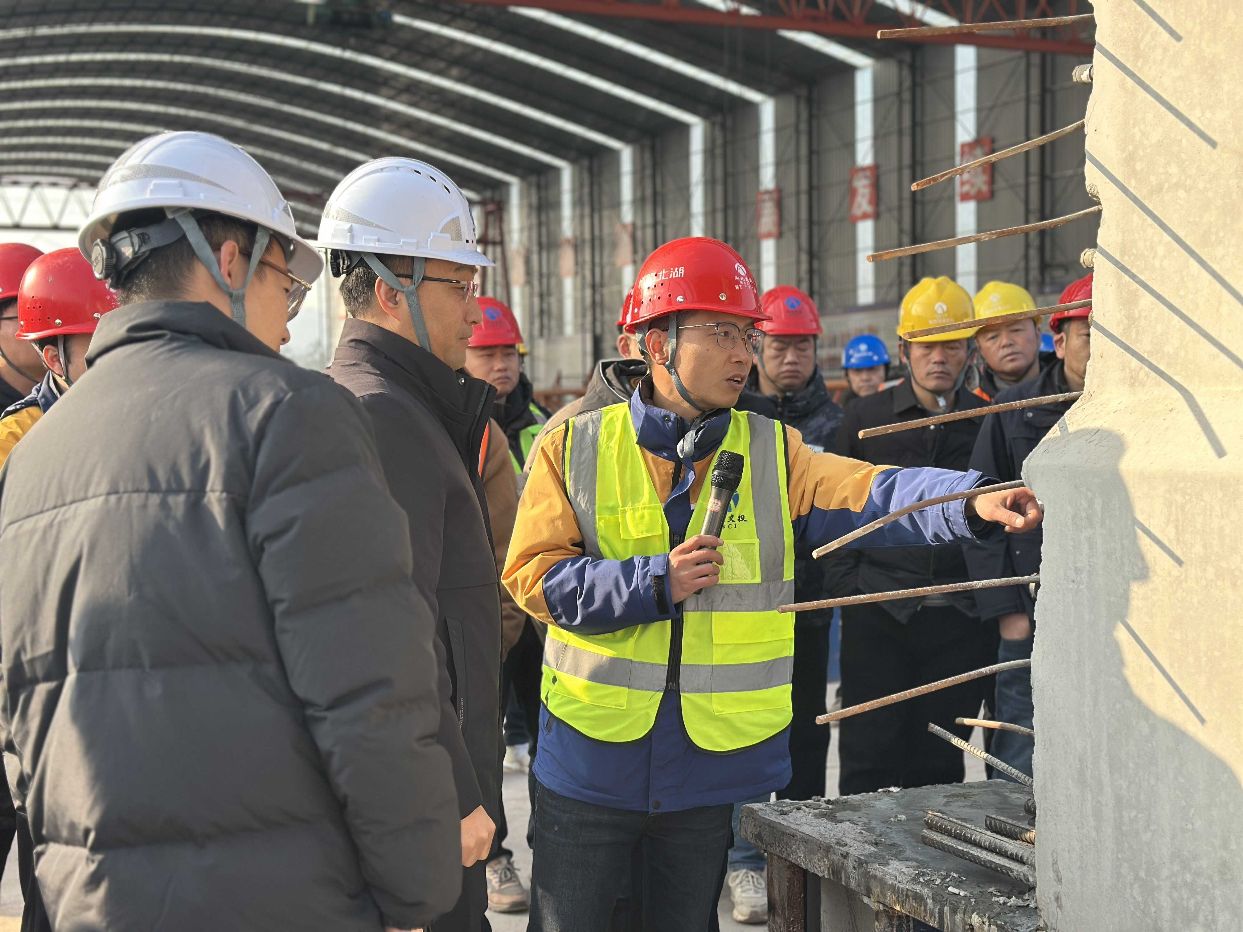 項目總工程師黃齊龍系統介紹了預制T梁施工的關鍵環節與創新亮點。從原材料嚴格檢測與分區分類管理,到采用數控彎曲機、液壓打彎鉗等設備實現鋼筋加工的高精度與高效率;從腹板、頂板鋼筋采用移動胎架集中制作、整體吊裝的安全高效模式,到液壓模板的應用大幅提升模板裝拆效率并保護構件外觀;從智能養生噴淋系統根據環境自動調節,到冬季棚布覆蓋蒸氣養生的精細化,全面體現了項目對施工質量的前置控制和過程把控。